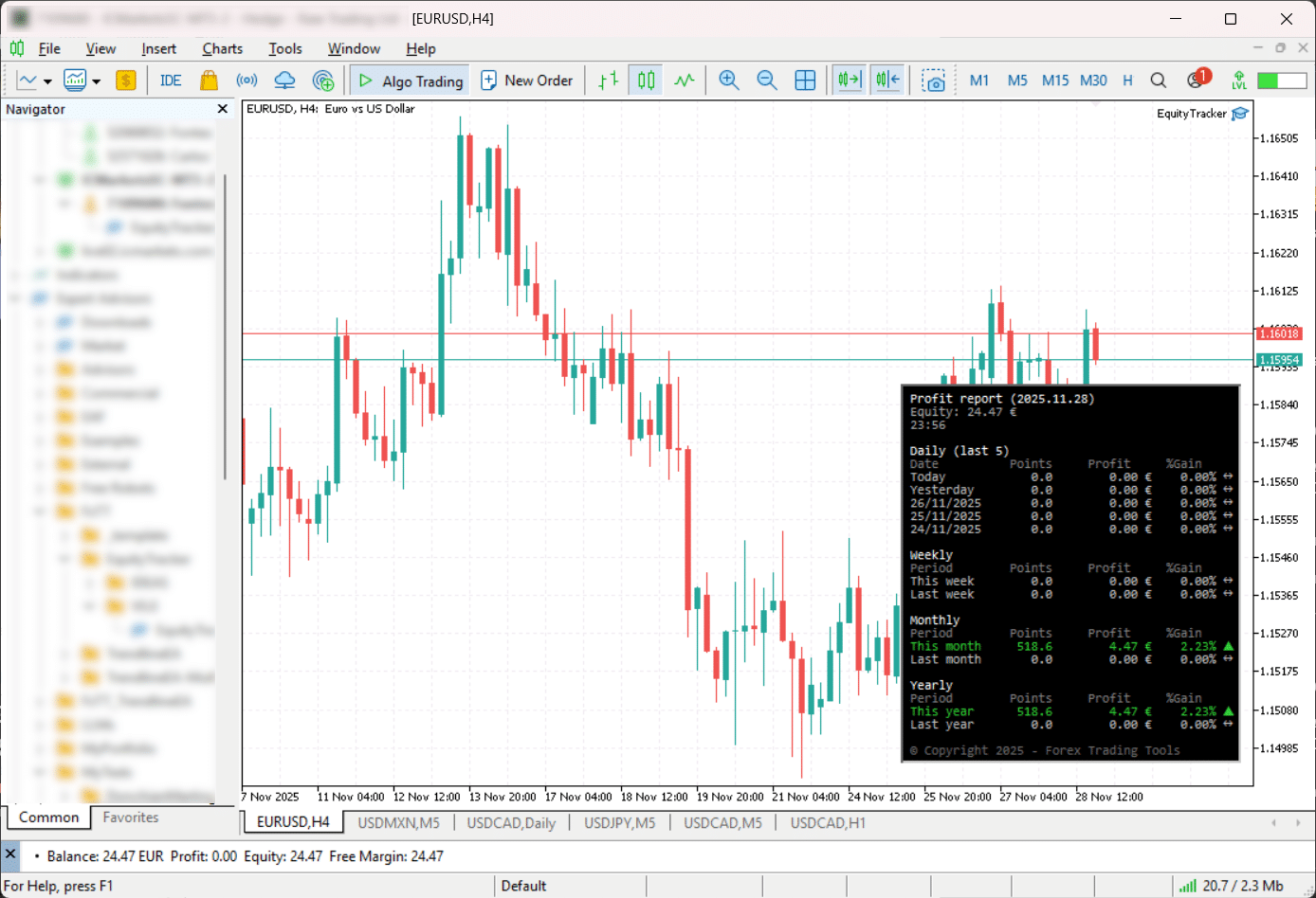 Attach Equity Tracker MT5 to a single chart and monitor all trades on the account — manual and automated, across all symbols and timeframes.
