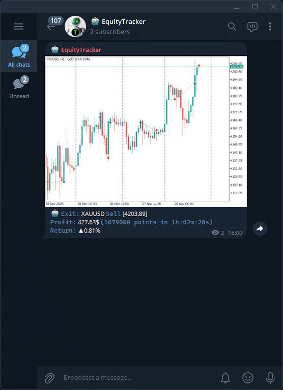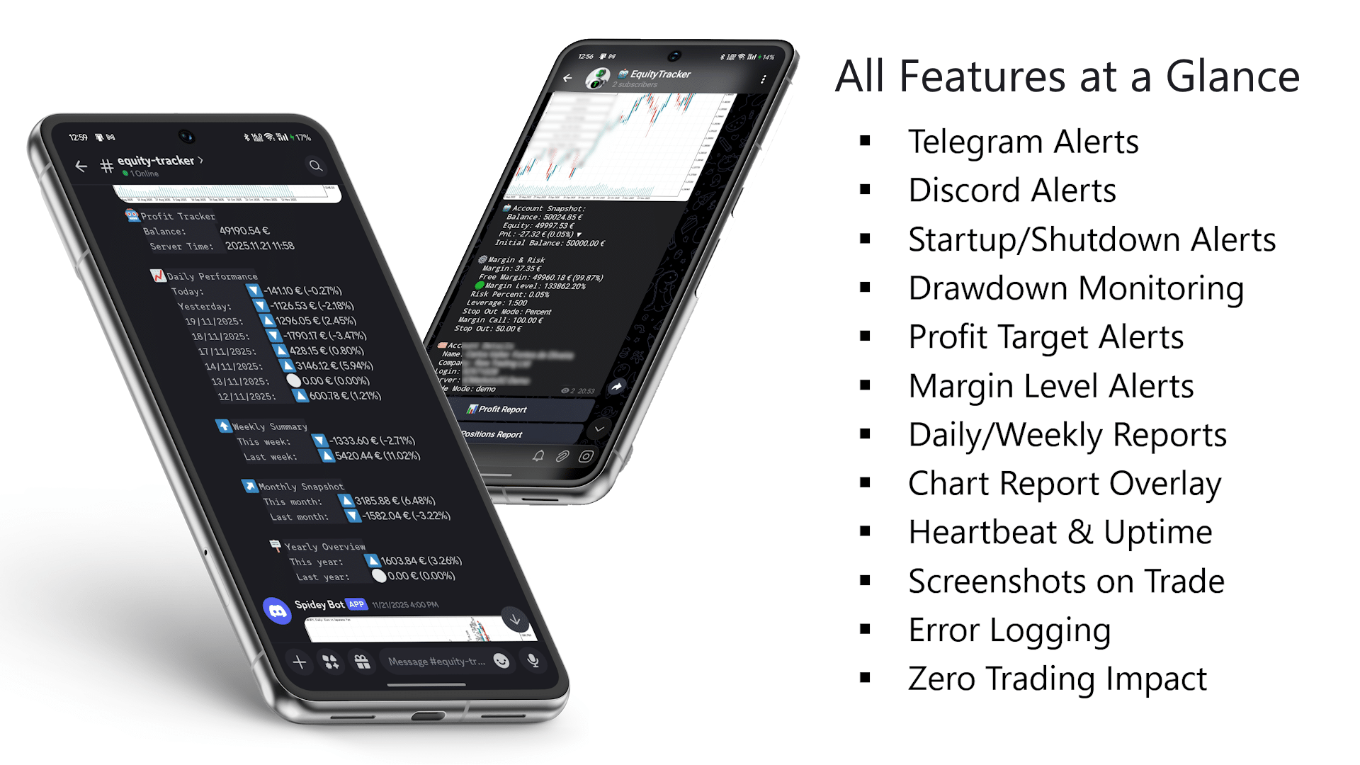 Receive hourly, daily or weekly PnL summaries automatically. Track balance, equity and today’s profit directly on your phone or on-chart overlay.