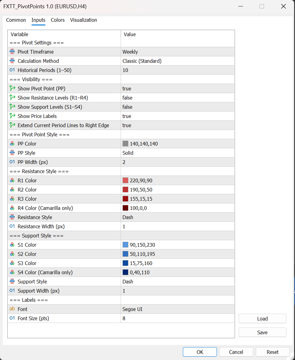 - Keep only the levels you use (for example, PP, R1/R2, and S1/S2).